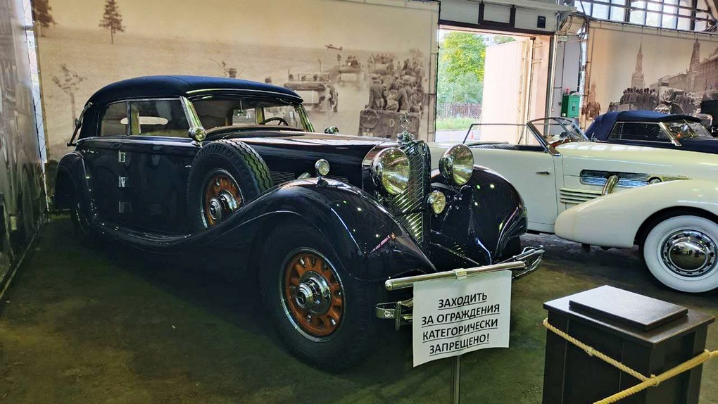 Посетителя встречают два гражданских автомобиля того времени, и каких! Mercedes-Benz 770 «Гроссе Мерседес» и американский Corvette 712.